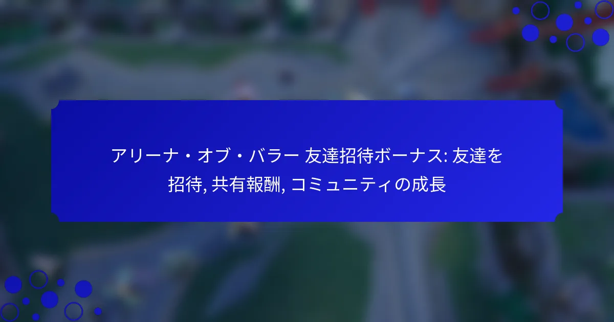 『アリーナ・オブ・バロー』の紹介ボーナスプログラムは、プレイヤーが友達をゲームに招待することで報酬を得る機会を提供します。紹介リンクやコードを使用することで、紹介者と新しいプレイヤーの両方が共有の利益を享受でき、ゲーム体験を向上させながらコミュニティの成長に貢献します。 『アリーナ・オブ・バロー』の紹介ボーナスプログラムとは? 『アリーナ・オブ・バロー』の紹介ボーナスプログラムは、プレイヤーが友達をゲームに招待することで報酬を得ることを目的としています。参加者は新しいプレイヤーを成功裏に紹介することでボーナスを獲得し、コミュニティの成長とエンゲージメントを促進します。 紹介プログラムの定義と目的 紹介プログラムは、既存のプレイヤーが友達を『アリーナ・オブ・バロー』に招待することを可能にし、より活気のあるゲームコミュニティを作り出します。プレイヤーにゲームを共有するインセンティブを与えることで、プログラムはプレイヤーベースを増やし、全体的なゲーム体験を向上させることを目指しています。 その主な目的は、ゲーム内での社会的相互作用を促進し、新規プレイヤーと既存プレイヤーの両方にとってより楽しい体験を提供することです。この取り組みは、プレイヤーに報酬を与えるだけでなく、『アリーナ・オブ・バロー』の周りにより強固なコミュニティを築く手助けもします。 紹介ボーナスシステムの仕組み 紹介ボーナスシステムに参加するには、プレイヤーは友達と共有できるユニークな紹介リンクを生成する必要があります。このリンクを使用して新しいプレイヤーがアカウントを作成し、特定のレベルに達すると、紹介者は報酬を得ることができます。 ボーナスには、ゲーム内通貨、限定スキン、またはその他の貴重なアイテムが含まれる場合があります。具体的な報酬は、成功した紹介の数や新しいプレイヤーが達成したレベルに基づいて異なる場合があります。 アカウントからユニークな紹介リンクを生成します。 ソーシャルメディアやメッセージングアプリを通じて友達とリンクを共有します。 友達が必要なマイルストーンに達したときに報酬を得ます。 参加者の資格基準 紹介プログラムに参加するには、プレイヤーはアクティブな『アリーナ・オブ・バロー』アカウントを持っている必要があります。さらに、紹介された友達は、以前にゲームに登録していない新しいプレイヤーでなければなりません。 年齢制限がある場合があり、参加者は地域の規制に応じて一定の年齢以上である必要があります。プレイヤーは、失格を避けるためにゲームの利用規約を遵守していることを確認する必要があります。 紹介プログラムに参加するメリット 紹介プログラムに参加することで、貴重なゲーム内報酬を得る機会を含むいくつかのメリットがあります。これらのボーナスは、ゲームプレイを向上させ、プレイヤーに他では簡単に入手できないユニークなアイテムを提供します。 さらに、友達を招待することで、友達と一緒にプレイすることでエンゲージメントや満足度が向上し、より楽しいゲーム体験につながります。ゲーム内で友達のコミュニティを築くことは、試合中のチームワークや協力を向上させることにもつながります。 コミュニティの成長とエンゲージメントへの影響 紹介プログラムは、プレイヤーが他の人を招待することを促すことでコミュニティの成長に大きく貢献します。この新しいプレイヤーの流入は、より多様で活発なプレイヤーベースを生み出し、全体的なゲーム環境を向上させます。 より多くのプレイヤーが参加することで、コミュニティのエンゲージメントは社会的相互作用、イベント、競技を通じて増加します。大きなプレイヤーベースは、開発者からのより頻繁なアップデートや改善にもつながり、関与するすべての人に利益をもたらします。 友達を『アリーナ・オブ・バロー』に招待するにはどうすればよいですか? 友達を『アリーナ・オブ・バロー』に招待するのは簡単なプロセスで、共有報酬を通じてゲーム体験を向上させることができます。紹介リンクやコードを活用することで、新しいプレイヤーをコミュニティに簡単に招き入れ、さまざまなインセンティブを享受できます。 招待を送るためのステップバイステッププロセス 友達を『アリーナ・オブ・バロー』に招待するには、以下の簡単な手順に従ってください: デバイスで『アリーナ・オブ・バロー』アプリを開きます。 設定またはコミュニティタブに通常ある紹介セクションに移動します。 ユニークな紹介リンクまたはコードを生成します。 このリンクまたはコードをソーシャルメディア、メッセージングアプリ、またはメールで友達と共有します。 友達が登録時にリンクまたはコードを使用するように促し、報酬を受け取れるようにします。…