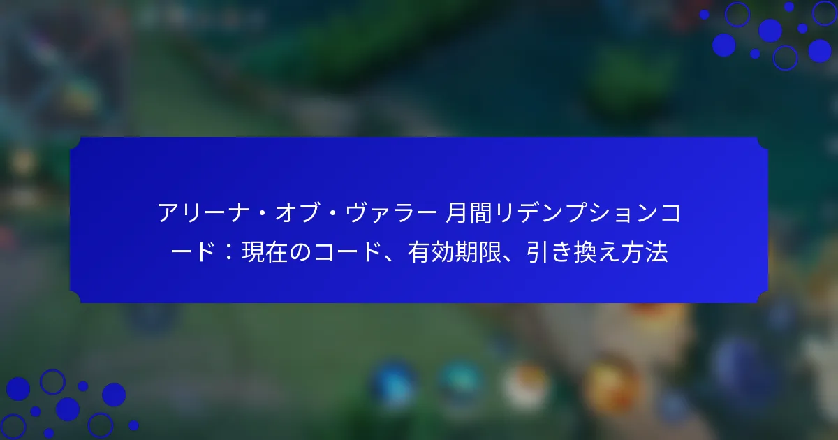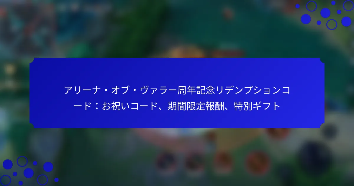 アリーナ・オブ・バラーの周年記念リデンプションコードは、プレイヤーにゲームのマイルストーンを祝う機会を提供し、特別な報酬やギフトを得ることができます。期間限定で利用可能なこれらのコードは、ゲーム内通貨、ユニークなスキン、ヒーローをアンロックし、全体的なゲーム体験を向上させます。リデンプションを行うには、プレイヤーは設定メニューにコードを入力し、リデンプションを確認するだけです。 現在のアリーナ・オブ・バラーの周年記念リデンプションコードは何ですか? 現在のアリーナ・オブ・バラーの周年記念リデンプションコードは、プレイヤーにゲームのマイルストーンを祝うための特別な報酬やギフトを提供します。これらのコードは通常、期間限定で利用可能なため、特典を楽しむためには迅速にリデンプションを行うことが重要です。 有効なリデンプションコードとその有効期限のリスト 以下は、有効なリデンプションコードとその有効期限です: ANNIVERSARY2023 – 有効期限:2023年12月31日 CELEBRATEAOV – 有効期限:2023年11月30日 GIFT4YOU – 有効期限:2024年1月15日 これらのコードを有効期限内にゲームに入力して、関連する報酬を受け取ることを忘れないでください。 リデンプションコードの有効性を確認する方法 リデンプションコードの有効性を確認するには、プレイヤーはゲームの指定されたセクションにコードを入力する必要があります。コードが有効であれば、報酬とともに確認メッセージが表示されます。無効なコードの場合は、コードが受け入れられないことを示すエラーメッセージが表示されます。 さらに、プレイヤーは公式発表やコミュニティフォーラムでコードの有効性や変更についての最新情報を確認できます。 リデンプションコードに関する一般的な問題 プレイヤーはコードをリデンプションしようとする際に、いくつかの一般的な問題に直面することがあります。よくある問題の一つは、コードを誤って入力することで、無効なコードエラーが発生することです。常にタイプミスや不正確な文字がないかを再確認してください。 もう一つの問題は、コードの有効期限です。コードが期限切れの場合、使用できないため、プレイヤーは有効期限を把握しておく必要があります。場合によっては、サーバーの問題が一時的にコードのリデンプションに影響を与えることもあります。 最新のコードを見つける場所 最新のアリーナ・オブ・バラーのリデンプションコードは、公式ゲームウェブサイト、ソーシャルメディアページ、またはコミュニティフォーラムで見つけることができます。開発者は特別なイベントや周年記念の際に新しいコードを頻繁に投稿するため、これらのプラットフォームに接続しておくことが有益です。 さらに、ゲームニュースサイトは、新しいコードが利用可能になると記事を公開することがあり、プレイヤーに最新のオファーを見つけるための別のリソースを提供します。 リデンプションコードのコミュニティソース コミュニティソースは、リデンプションコードを共有する上で重要な役割を果たします。プレイヤーは、Reddit、Discord、アリーナ・オブ・バラー専用のFacebookグループなどのプラットフォームでコードを共有することがよくあります。これらのコミュニティに参加することで、広く宣伝されていないコードを発見する手助けが得られます。 コミュニティメンバーが共有するコードの信頼性を確認することが重要です。古くなったり無効な場合があるため、可能な限り公式ソースと照らし合わせて、コードが正当であることを確認してください。 アリーナ・オブ・バラーの周年記念コードをリデンプションするにはどうすればよいですか? アリーナ・オブ・バラーの周年記念コードをリデンプションするには、プレイヤーはゲーム内で簡単な手順に従う必要があります。これには、設定メニューにアクセスし、コードを入力し、リデンプションを確認して特別な報酬を受け取ることが含まれます。 ゲーム内でのコードリデンプションのステップバイステップガイド…