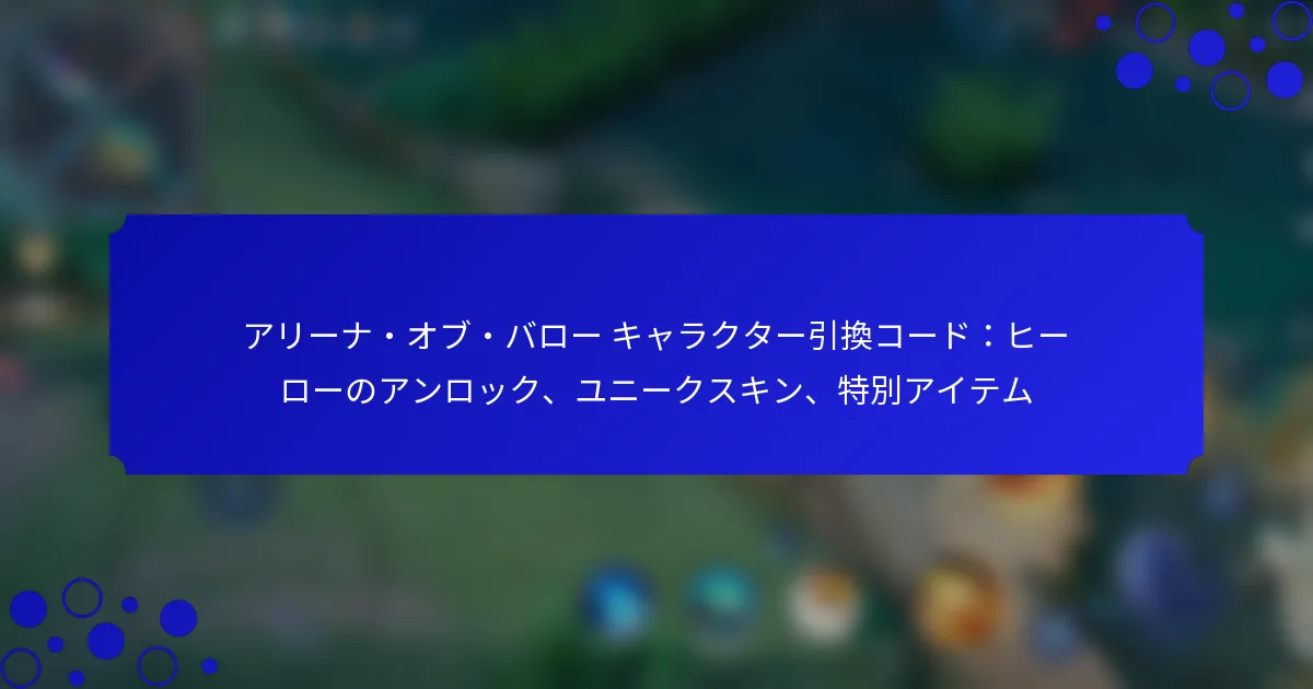アリーナ・オブ・バラーの周年記念リデンプションコードは、プレイヤーにゲームのマイルストーンを祝う機会を提供し、特別な報酬やギフトを得ることができます。期間限定で利用可能なこれらのコードは、ゲーム内通貨、ユニークなスキン、ヒーローをアンロックし、全体的なゲーム体験を向上させます。リデンプションを行うには、プレイヤーは設定メニューにコードを入力し、リデンプションを確認するだけです。 現在のアリーナ・オブ・バラーの周年記念リデンプションコードは何ですか? 現在のアリーナ・オブ・バラーの周年記念リデンプションコードは、プレイヤーにゲームのマイルストーンを祝うための特別な報酬やギフトを提供します。これらのコードは通常、期間限定で利用可能なため、特典を楽しむためには迅速にリデンプションを行うことが重要です。 有効なリデンプションコードとその有効期限のリスト 以下は、有効なリデンプションコードとその有効期限です: ANNIVERSARY2023 – 有効期限:2023年12月31日 CELEBRATEAOV – 有効期限:2023年11月30日 GIFT4YOU – 有効期限:2024年1月15日 これらのコードを有効期限内にゲームに入力して、関連する報酬を受け取ることを忘れないでください。 リデンプションコードの有効性を確認する方法 リデンプションコードの有効性を確認するには、プレイヤーはゲームの指定されたセクションにコードを入力する必要があります。コードが有効であれば、報酬とともに確認メッセージが表示されます。無効なコードの場合は、コードが受け入れられないことを示すエラーメッセージが表示されます。 さらに、プレイヤーは公式発表やコミュニティフォーラムでコードの有効性や変更についての最新情報を確認できます。 リデンプションコードに関する一般的な問題 プレイヤーはコードをリデンプションしようとする際に、いくつかの一般的な問題に直面することがあります。よくある問題の一つは、コードを誤って入力することで、無効なコードエラーが発生することです。常にタイプミスや不正確な文字がないかを再確認してください。 もう一つの問題は、コードの有効期限です。コードが期限切れの場合、使用できないため、プレイヤーは有効期限を把握しておく必要があります。場合によっては、サーバーの問題が一時的にコードのリデンプションに影響を与えることもあります。 最新のコードを見つける場所 最新のアリーナ・オブ・バラーのリデンプションコードは、公式ゲームウェブサイト、ソーシャルメディアページ、またはコミュニティフォーラムで見つけることができます。開発者は特別なイベントや周年記念の際に新しいコードを頻繁に投稿するため、これらのプラットフォームに接続しておくことが有益です。 さらに、ゲームニュースサイトは、新しいコードが利用可能になると記事を公開することがあり、プレイヤーに最新のオファーを見つけるための別のリソースを提供します。 リデンプションコードのコミュニティソース コミュニティソースは、リデンプションコードを共有する上で重要な役割を果たします。プレイヤーは、Reddit、Discord、アリーナ・オブ・バラー専用のFacebookグループなどのプラットフォームでコードを共有することがよくあります。これらのコミュニティに参加することで、広く宣伝されていないコードを発見する手助けが得られます。 コミュニティメンバーが共有するコードの信頼性を確認することが重要です。古くなったり無効な場合があるため、可能な限り公式ソースと照らし合わせて、コードが正当であることを確認してください。 アリーナ・オブ・バラーの周年記念コードをリデンプションするにはどうすればよいですか? アリーナ・オブ・バラーの周年記念コードをリデンプションするには、プレイヤーはゲーム内で簡単な手順に従う必要があります。これには、設定メニューにアクセスし、コードを入力し、リデンプションを確認して特別な報酬を受け取ることが含まれます。 ゲーム内でのコードリデンプションのステップバイステップガイド…