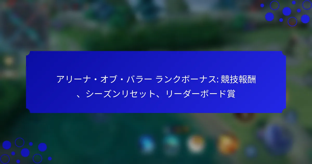アリーナ・オブ・バラーのゴールドボーナスシステムは、プレイヤーが定期的にプレイし、イベントに参加することで追加のゲーム内通貨を獲得できるようにし、ゲーム体験を向上させます。デイリーリワードは、プレイヤーが継続的にログインすることを促進し、さまざまなアイテムやボーナスを提供します。季節イベントはさらにゲームプレイを豊かにし、魅力的なアクティビティやマイルストーンを通じてゴールドを獲得する機会を提供します。 アリーナ・オブ・バラーのゴールドボーナスシステムとは? アリーナ・オブ・バラーのゴールドボーナスシステムは、プレイヤーに追加のゲーム内通貨を報酬として提供し、ゲーム体験を向上させます。このシステムは、定期的なプレイやさまざまなイベントへの参加を促進するように設計されており、プレイヤーがより効率的にゴールドを蓄積できるようにします。 ゴールドボーナスの定義と目的 ゴールドボーナスとは、プレイヤーの日常的な活動、季節イベント、プレイヤーマイルストーンに基づいて与えられる追加の通貨を指します。その主な目的は、エンゲージメントを促し、一貫したゲームプレイを報酬することで、プレイヤーがヒーローやスキン、その他のゲーム内アイテムを取得しやすくすることです。 ゴールドボーナスシステムを導入することで、アリーナ・オブ・バラーは、プレイヤーが毎日ログインし、イベントに参加することを促す、より報酬のある環境を作り出すことを目指しています。これはプレイヤーの満足度を向上させるだけでなく、ゲーム内のコミュニティ意識を育むことにもつながります。 ゴールドボーナスがゲームプレイを向上させる方法 ゴールドボーナスは、プレイヤーがより迅速に進行するために必要なリソースを提供することで、ゲームプレイを大幅に向上させます。追加のゴールドを使用して、新しいヒーローやスキンを購入することで、全体的なゲーム体験や戦略を改善できます。 さらに、これらのボーナスはプレイヤー間の競争を平等にし、新しいプレイヤーが経験豊富なベテランとより効果的に競えるようにします。これにより、すべての参加者にとってよりバランスの取れた楽しいゲーム環境が生まれます。 利用可能なボーナスの種類 デイリーリワード: プレイヤーは、ログインしてデイリーミッションを完了することでゴールドボーナスを受け取ります。 季節イベント: 特別なイベントは、特定のテーマや休日に関連するユニークなボーナスを提供し、しばしばより多くのゴールドを提供します。 プレイヤーマイルストーン: 特定のレベルに達したり、特定のチャレンジを完了することで、かなりのゴールド報酬を得ることができます。 ゴールドボーナスの資格基準 ゴールドボーナスを受け取るためには、プレイヤーは特定の基準を満たす必要があります。通常、これには定期的にログインし、指定されたイベントに参加することが含まれます。デイリーリワードは通常、単にログインするだけで付与されますが、季節イベントでは特定のタスクを完了する必要がある場合があります。 さらに、プレイヤーはアカウントが良好な状態であることを確認する必要があります。ゲームルールに違反すると、ボーナスを受け取る資格を失う可能性があります。アクティブでエンゲージしていることが、ゴールド獲得を最大化するための鍵です。 ボーナスの計算方法 ゴールドボーナスの計算は、ボーナスの種類によって異なります。デイリーリワードは通常、固定のゴールド額を提供しますが、季節イベントでは完了したタスクの難易度に応じて変動する額を提供することがあります。 プレイヤーマイルストーンは、達成の重要性に基づいてプレイヤーにゴールドを報酬として与え、より難しいマイルストーンはより高いボーナスをもたらします。プレイヤーは自分の進捗を追跡し、ゴールド蓄積戦略を最適化する必要があります。 アリーナ・オブ・バラーのデイリーリワードはどのように機能しますか? アリーナ・オブ・バラーのデイリーリワードは、プレイヤーが定期的にログインしてゲームをプレイするためのインセンティブです。これらの報酬には、さまざまなゲーム内アイテム、通貨、全体的なゲーム体験を向上させるボーナスが含まれます。 デイリーリワードの構造の概要 デイリーリワードシステムは、プレイヤーが毎日ログインするだけで価値のあるアイテムを提供することで、一貫したゲームプレイを促進するように設計されています。報酬は通常、プレイヤーが数日間連続してログインし続けると、その価値が増加します。この構造は、定期的なプレイヤーを報酬するだけでなく、休止していたプレイヤーがゲームに戻ることを促します。 プレイヤーは、最初の数日間は基本的なアイテムを提供し、後の日にはより重要な報酬を提供する段階的な報酬システムを期待できます。これにより、プレイヤーはデイリ