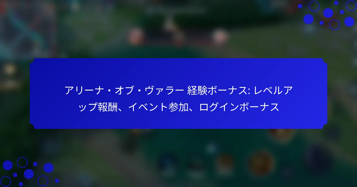 アリーナ・オブ・バラーは、さまざまなゲーム内活動に参加することでプレイヤーの進行を促進する経験ボーナスを提供します。イベントに参加したり定期的にログインしたりすることで、プレイヤーはレベルアップを加速させ、ゲーム内通貨、ヒーロー、スキンなどの貴重な報酬を獲得できます。これらのインセンティブは、ゲーム体験を豊かにするだけでなく、活気あるアリーナ・オブ・バラーコミュニティへの積極的な参加を促します。 アリーナ・オブ・バラーの経験ボーナスとは? アリーナ・オブ・バラーの経験ボーナスは、さまざまなゲーム内活動を通じてプレイヤーの進行を促進する報酬です。これらのボーナスは、レベルアップを大幅に加速させ、イベントへの参加や定期的なログインに対する追加のインセンティブを提供します。 経験ボーナスの定義と目的 アリーナ・オブ・バラーの経験ボーナスは、プレイヤーのゲーム内でのエンゲージメントや活動に対して報酬を与えるように設計されています。これらは、一貫したプレイと特別イベントへの参加を促し、最終的には全体的なゲーム体験を向上させる役割を果たします。 これらのボーナスの主な目的は、プレイヤーがアカウントをレベルアップし、新しいヒーロー、スキン、その他のコンテンツをアンロックするための迅速な道を提供することです。これらのインセンティブを提供することで、ゲームはより活発なコミュニティを育み、プレイヤーが自分の進行に投資し続けるようにします。 利用可能な経験ボーナスの種類 アリーナ・オブ・バラーでプレイヤーが獲得できる経験ボーナスにはいくつかの種類があり、それぞれに独自の利点があります。これには以下が含まれます: レベルアップ報酬:プレイヤーは特定のレベルに到達することでボーナスを受け取り、これにはゲーム内通貨、アイテム、またはヒーローが含まれることがあります。 イベント参加ボーナス:期間限定のイベントに参加することで追加の経験値を得ることができ、新しいコンテンツに関与することを促します。 ログインボーナス:定期的にゲームにログインすることで、日々の経験値ブーストを得ることができ、時間をかけてレベルアップを促進します。 各ボーナスの種類は、プレイヤーがゲームのさまざまな側面を探求し、彼らのコミットメントと活動に報いるように設計されています。 経験ボーナスがゲームプレイに与える影響 経験ボーナスは、プレイヤーがより迅速にレベルアップできるようにすることで、ゲームプレイに大きな影響を与える可能性があります。これにより、新しいヒーローや能力がアンロックされ、プレイヤーはより多様なゲームプレイ体験を得ることができます。 さらに、これらのボーナスを利用するプレイヤーは、試合でより競争力を持つことができるかもしれません。なぜなら、高いレベルはしばしばより良い装備やスキルに関連しているからです。これにより、新しいプレイヤーとベテランプレイヤーの両方にとって、より魅力的でダイナミックな環境が生まれます。 経験ボーナスの資格基準 アリーナ・オブ・バラーで経験ボーナスを受け取るには、プレイヤーは通常、特定の基準を満たす必要があります。これには以下が含まれることがあります: アカウントレベル:ボーナスは、最低限のアカウントレベルに達したプレイヤーにのみ提供される場合があります。 イベント参加:プレイヤーは、関連するボーナスを得るために特定のイベントに積極的に参加する必要があります。 デイリーログイン:ログインボーナスを受け取るには、一貫したデイリーログインが必要な場合が多いです。 これらの資格基準を理解することは、プレイヤーが利用可能な報酬を最大化するために重要です。 ボーナスの期間と利用可能性 経験ボーナスの期間と利用可能性は、ボーナスの種類によって大きく異なる場合があります。レベルアップ報酬は通常恒久的ですが、特定のマイルストーンがある場合があります。イベント参加ボーナスは、イベントの期間に合わせて時間制限があることが多いです。 ログインボーナスは通常、毎日リセットされ、プレイヤーに一貫してログインすることを促します。プレイヤーは、ボーナスがいつ利用可能で、どのくらいの期間続くかを把握するために、アナウンスやゲーム内通知に注意を払うべきです。 報酬を最大化するために、プレイヤーはこれらのスケジュールに合わせてゲームプレイを計画し、イベントに参加し、定期的にログインして経験ボーナスをフルに活用することを確保する必要があります。 アリーナ・オブ・バラーのレベルアップ報酬はどのように機能しますか? アリーナ・オブ・バラーのレベルアップ報酬は、プレイヤーがさまざまなプレイヤーレベルを進行する際に与えられるインセンティブです。これらの報酬には、ゲーム内通貨、ヒーロー、スキン、その他の貴重なアイテムが含まれ、ゲーム体験を向上さ