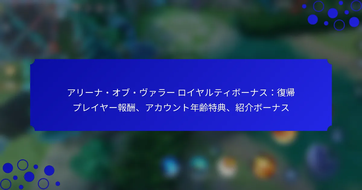 『アリーナ・オブ・バラー』では、復帰プレイヤーを奨励するためのさまざまなロイヤルティボーナスが用意されており、ゲーム内通貨、ヒーロー、その他の貴重なアイテムが含まれています。報酬はアカウントの年数によって影響を受け、長くプレイしているプレイヤーにはより良い特典が与えられます。さらに、プレイヤーは友達を招待することで紹介ボーナスを獲得でき、双方にとって相互に有益な体験を生み出します。 『アリーナ・オブ・バラー』の復帰プレイヤー向けロイヤルティボーナスとは? 『アリーナ・オブ・バラー』の復帰プレイヤー向けロイヤルティボーナスは、一定期間非アクティブだったプレイヤーがゲームに戻ることを奨励するために設計された報酬です。これらのボーナスには、ゲーム内通貨、ヒーロー、ゲーム体験を向上させるその他の貴重なアイテムが含まれることがあります。 復帰プレイヤー報酬の概要 復帰プレイヤー報酬は、一定期間『アリーナ・オブ・バラー』にログインしていないプレイヤーに提供されるインセンティブです。これらの報酬は、プレイヤーが再びゲームに参加するよう促すために、有用なアイテムやボーナスを提供します。 報酬は非アクティブの期間に応じて異なり、長期間の不在にはより大きなボーナスが用意されています。プレイヤーは、一定期間の非アクティブの後にアカウントに再ログインするだけで、これらの報酬を受け取ることができます。 復帰プレイヤーボーナスの資格基準 復帰プレイヤーボーナスを受け取るには、プレイヤーは特定の期間非アクティブである必要があります。通常、この期間は数週間から数ヶ月にわたります。正確な期間は、ゲームの現在のプロモーションイベントによって異なる場合があります。 プレイヤーはまた、ゲームの利用規約を満たす登録済みのアカウントを持っている必要があります。新しいアカウントや一度も非アクティブになったことがないアカウントは、これらのロイヤルティボーナスの対象にはなりません。 復帰プレイヤー報酬の請求方法 復帰プレイヤー報酬の請求は簡単なプロセスです。プレイヤーは、指定された非アクティブ期間の後にアカウントにログインする必要があります。ログインすると、通常、報酬の資格についての通知が届きます。 通知を受け取った後、プレイヤーは指示に従って報酬を請求できます。報酬は通常、ゲーム内のインベントリに直接配信されます。プロモーションイベント中に必要な追加手順があるかどうかを確認することが重要です。 復帰プレイヤー向け報酬の例 ゴールドやジェムなどのゲーム内通貨。 購入できない限定ヒーローやスキン。 レベルアップを早めるための経験値ブースト。 ゲームプレイを向上させる特別なアイテムやリソース。 これらの報酬は、ゲーム体験を大幅に向上させ、復帰時にプレイヤーに競争優位を提供します。 復帰プレイヤー報酬の条件と制限 復帰プレイヤー報酬は魅力的ですが、考慮すべき条件と制限があります。報酬は限られた期間のみ利用可能であり、プレイヤーはプロモーション期間内にログインする必要があります。 さらに、一部の報酬には使用方法に制限がある場合や、特定のゲームモードにのみ適用される場合があります。プレイヤーは、各報酬に関連する具体的な条件を確認し、制限を理解することが重要です。 アカウントの年数は『アリーナ・オブ・バラー』のロイヤルティボーナスにどのように影響しますか? アカウントの年数は『アリーナ・オブ・バラー』のロイヤルティボーナスに大きく影響し、プレイヤーがアカウントを維持している期間に基づいて報酬が与えられます。アカウントの年数が長いほど、報酬が向上し、全体的なゲーム体験が改善され、復帰プレイヤーへのインセンティブが提供されます。 アカウント年数の特典の定義 アカウント年数の特典とは、プレイヤーがアカウントの存在期間に基づいて受け取る報酬を指します。これらの特典は、プレイヤーの定着を促し、忠誠心を報いるために設計されています。プレイヤーが時間をかけてゲームに関与し続けることで、さまざまなボーナスがアンロックされ、ゲーム体験が向上します。 通常、特典はアカウントが古くなるにつれて価値が増し、プレイヤーがアクティブでいる期間が長いほど、より大きな報酬が得られます。このシステムは、長期的なプレイヤーのコミットメントを認識し、評価するものであり、ゲームのロイヤルティプログラムの重要な側面となっています。 アカウント年数報酬の基準 アカウント年数報酬を受け取るには、プレイヤーはアカウントの作成日関連の特定の基準を満たす必要があります。一般的に、アカウントがアクティブである期間が長いほど、プレイヤーが得られる報酬も増えます。たとえば、プレイヤーは30日、90日、そしてその後は毎年のマイルストーンでボーナスを受け取ることができます。 アカウントは良好