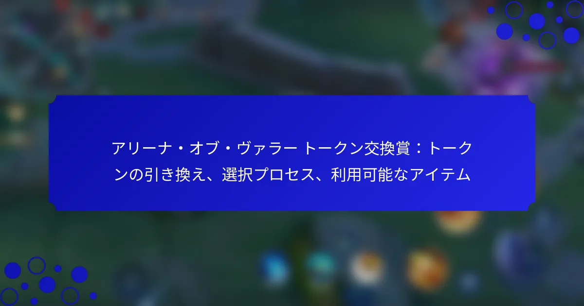 アリーナ・オブ・ヴァラーでは、プレイヤーはゲーム内ショップのトークン交換オプションを通じて獲得したトークンを引き換えることで、ゲーム体験を向上させることができます。賞品の選択プロセスには、特定の資格基準を満たし、制限に従うことが含まれ、公平な交換が保証されます。利用可能なアイテムにはスキン、ヒーロー、独占アクセサリーが含まれ、それぞれがユニークな利点と美的要素を提供します。 アリーナ・オブ・ヴァラーでトークンを引き換えるにはどうすればよいですか? アリーナ・オブ・ヴァラーでトークンを引き換えるには、プレイヤーはゲーム内ショップにアクセスし、トークン交換オプションを選択する必要があります。このプロセスにより、プレイヤーは獲得したトークンをさまざまな報酬と交換し、ゲーム体験を向上させることができます。 トークン引き換えのステップバイステッププロセス まず、アリーナ・オブ・ヴァラーを起動し、メインメニューに移動します。そこから、ショップアイコンを見つけてクリックし、ショップインターフェースを開きます。ショップ内で、利用可能な報酬を確認できるトークン交換セクションを見つけます。 トークン交換エリアに入ったら、引き換えたいアイテムを選択します。希望するアイテムに対して十分なトークンがあることを確認し、選択を確定して引き換えプロセスを完了します。アイテムが正常にインベントリに追加されたことを示す確認メッセージが表示されます。 トークン引き換えの前提条件 トークンを引き換える前に、プレイヤーはアクティブなアカウントを持ち、ゲームプレイを通じて十分なトークンを蓄積している必要があります。トークンは、さまざまなイベントに参加したり、ミッションを完了したり、ゲーム内のマイルストーンを達成することで獲得できます。 さらに、トークン引き換え機能はアップデートによって変更される可能性があるため、ゲームが最新バージョンに更新されていることを確認してください。トークン交換イベントや特定の条件が必要な期間限定オファーに関する発表を定期的に確認してください。 トークン引き換え中の一般的な問題 プレイヤーはトークンを引き換える際に、いくつかの一般的な問題に直面することがあります。よくある問題の一つは、トークンが不足していることで、これにより引き換えができなくなります。アイテムを引き換える前に、トークン残高を必ず再確認してください。 もう一つの問題は、接続の問題から生じることがあります。引き換えプロセス中にゲームが遅延したり切断されたりすると、取引が失敗する可能性があります。このような場合、ゲームを再起動するか、インターネット接続を確認することで問題を解決できることがあります。 トークン引き換えを成功させるためのヒント スムーズなトークン引き換え体験を確保するために、定期的にトークン残高を監視し、引き換えを計画的に行いましょう。限られた供給のアイテムや時間制限のあるオファーを優先して、報酬を最大化してください。 ボーナストークンや獲得率の向上を提供するイベントに参加することを検討してください。これにより、トークンをより早く蓄積できます。最後に、各アイテムに関連する条件を必ず読み、使用や期限に関する驚きを避けてください。 トークン引き換えの時間制限 アリーナ・オブ・ヴァラーでのトークン引き換えは、特別なイベントやプロモーション中に時間制限がある場合があります。プレイヤーは、希望するアイテムを逃さないように、トークンを引き換えるための締切を把握しておくべきです。 通常、イベントは数日から数週間続くことがあるため、イベントの期間について常に情報を得ておくことが重要です。ゲームの公式発表やソーシャルメディアチャンネルを定期的にチェックして、トークン引き換えのタイムラインや今後のイベントに関する更新を確認してください。 トークン交換賞品の選択プロセスはどのようになっていますか? アリーナ・オブ・ヴァラーにおけるトークン交換賞品の選択プロセスは、どのアイテムがトークンで引き換え可能かを決定するための体系的なアプローチを含みます。プレイヤーは特定の資格基準を満たし、選択制限に従う必要があります。 賞品選択の基準 賞品の選択基準には、通常、プレイヤー間でのアイテムの人気やゲーム内での認識された価値が含まれます。ゲームプレイを向上させるアイテムやユニークなコスメティック機能を提供するアイテムが優先されることが多いです。さらに、開発者はプレイヤーのフィードバックやアイテム使用のトレンドを考慮して選択を洗練させることがあります。 プレイヤーは、特定の賞品に対して十分なトークンを蓄積していることを確認する必要があります。各アイテムには異なるトークンコストが設定されており、全体の選択プロセスに影響を与えます。これらの基準