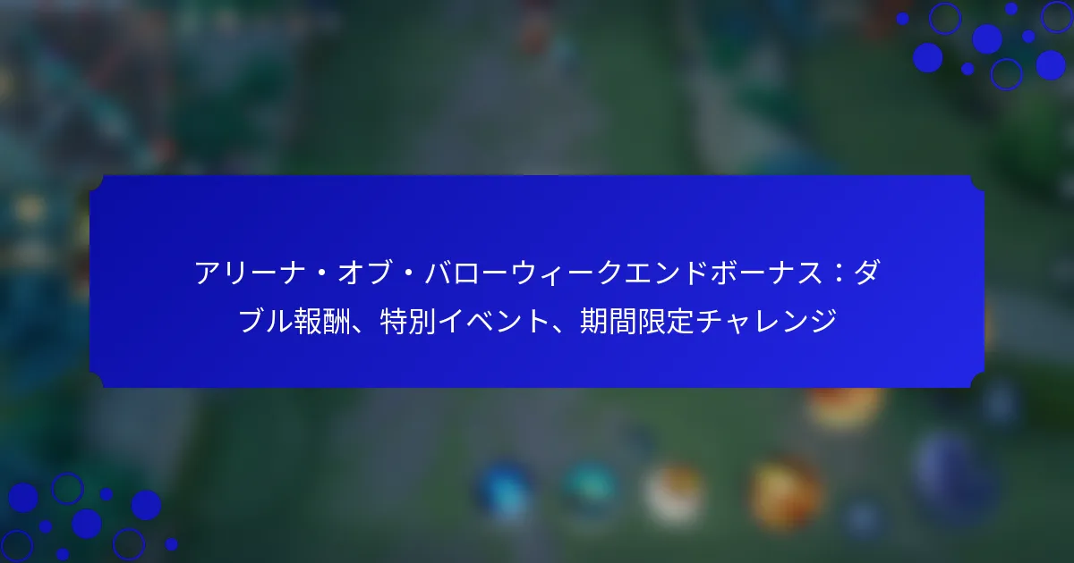 今週末、アリーナ・オブ・バラーでは、プレイヤーがダブル報酬、特別イベント、期間限定チャレンジなどのエキサイティングなボーナスを利用できる機会があります。これらの提供は、ゲーム体験を向上させるだけでなく、追加のゲーム内通貨やアイテムを獲得する機会も提供します。楽しみに参加して、これらの独占的な週末イベントを最大限に活用しましょう! アリーナ・オブ・バラーの週末ボーナスとは? アリーナ・オブ・バラーの週末ボーナスは、プレイヤーにダブル報酬、特別イベント、期間限定チャレンジを提供し、ゲーム体験を向上させます。これらのボーナスは参加を促し、週末にゲーム内通貨やアイテムをより多く獲得する機会を提供します。 アリーナ・オブ・バラーにおけるダブル報酬の定義 アリーナ・オブ・バラーにおけるダブル報酬は、指定された週末イベント中にプレイヤーが獲得できるゲーム内通貨と経験値の増加を指します。つまり、プレイした試合ごとに、プレイヤーは通常の報酬の2倍を受け取ることができ、進行状況とリソースが大幅に向上します。 この機能は、プレイヤーが週末により積極的に参加することを促すために設計されており、カジュアルなゲーマーと熱心なゲーマーの両方にとって、努力を最大限に活用する理想的な時期となります。ダブル報酬は、試合や特定のチャレンジなど、さまざまな活動に適用される可能性があります。 週末に利用可能な報酬の種類 週末ボーナス中、プレイヤーはゲームプレイ体験を向上させるさまざまな報酬を期待できます。報酬の種類は以下の通りです: ゲーム内通貨:プレイヤーは、ヒーロー、スキン、その他のアイテムを購入するために使用できる金や宝石を2倍獲得できます。 経験値:プレイヤーは2倍の経験値を受け取り、アカウントやヒーローのレベルアップをより早く行うことができます。 特別イベント報酬:期間限定イベントに参加することで、通常のゲームプレイでは入手できないユニークなアイテムやボーナスを得ることができます。 これらの報酬は、新しいヒーローやスキンの獲得を助けるだけでなく、プレイヤーがより迅速に進行できるようにすることで、全体的なゲーム体験を向上させます。 週末ボーナスの期間とタイミング 週末ボーナスは通常、金曜日の夕方から日曜日の夜まで実施され、プレイヤーがダブル報酬を活用するための十分な時間を提供します。具体的な開始時間と終了時間は異なる場合があるため、プレイヤーはゲーム内のお知らせや公式ソーシャルメディアチャンネルで正確な詳細を確認する必要があります。 これらのボーナスは、参加を最大化するためにピークゲーム時間に合わせてスケジュールされることが多く、週末はプレイヤーがゲームに参加し、報酬を増やすための最良の機会となります。 ボーナスを受け取るための資格基準 アリーナ・オブ・バラーの週末ボーナスを受け取るためには、プレイヤーは特定の基準を満たす必要があります。一般的に、ボーナス期間中にログインしたすべてのプレイヤーは自動的にダブル報酬の資格を得ます。ただし、一部の特別イベントでは、追加の報酬をアンロックするために特定のタスクやチャレンジを完了する必要がある場合があります。 プレイヤーは、安定したインターネット接続を持ち、サポートされているデバイスでプレイしてボーナスを十分に楽しむことを確認する必要があります。さらに、ランクマッチや特別イベントに参加することで、さらに大きな報酬を得られる可能性があるため、プレイヤーは利用可能なすべてのオプションを探求することをお勧めします。 ボーナスがゲームプレイ体験に与える影響 週末ボーナスは、プレイヤーに報酬を獲得する機会を増やすことで、ゲームプレイ体験を大幅に向上させます。この増加した獲得可能性は、ヒーローの獲得やアップグレードをより迅速に行うことにつながり、試合をより魅力的で競争力のあるものにします。 さらに、これらの週末中の特別イベントやチャレンジの興奮は、プレイヤー間のコミュニティ意識を育み、共通の目標を達成するために協力することを促します。全体的な影響は、参加と楽しみを促進する、よりダイナミックで報酬のあるゲーム環境です。 週末中にどのような特別イベントが開催されるのか? 週末中、アリーナ・オブ・バラーでは、プレイヤーにダブル報酬、ユニークなチャレンジ、期間限定オファーを提供するさまざまな特別イベントを開催します。これらのイベントは、ゲームプレイを向上させ、コミュニティ参加を促進し、プレイヤーのエンゲージメントに報いることを目的としています。 ユニークな週末イベントの概要 アリーナ・オブ・バラーの週末イベントには、通常の週には利用できない特別なゲームモードやチャレンジが含まれます。プレイヤーは、ヒーロー特有のイベントやチームワークと戦略を必要とする協力クエストなど、ユニークなテー