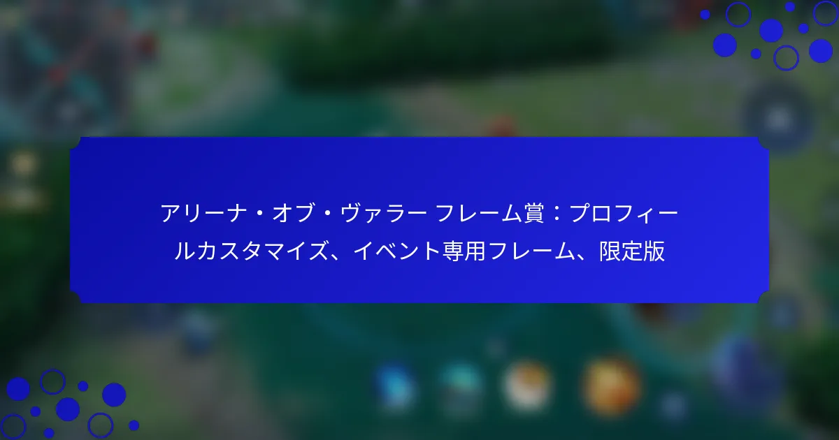 Arena of Valorでは、プレイヤーがプロフィールをカスタマイズし、成果を示すためのさまざまなフレーム賞を提供しています。これらのフレームは、イベントへの参加を通じて獲得したり、限定版として購入したり、通常のカスタマイズオプションから選択したりすることができ、プレイヤーは独自のスタイルを表現できます。特にイベント特有のフレームは、季節のテーマやゲーム内のお祝いを反映した独特のデザインが特徴で、ゲーム体験をさらに豊かにします。 Arena of Valorのフレーム賞とは? Arena of Valorのフレーム賞は、プレイヤーが獲得または購入してプロフィールを強化するためのカスタマイズ可能な視覚要素です。これらのフレームは、個性を表現する手段であるだけでなく、成果やイベントへの参加を示す方法でもあります。 フレーム賞の定義と重要性 Arena of Valorのフレーム賞は、プレイヤーがプロフィールに適用できる装飾的なボーダーです。これらは個々のスタイルや成果を反映し、プレイヤーがゲーム内で自分のアイデンティティを表現できるようにします。これらのフレームの重要性は、プレイヤーのエンゲージメントを高め、コミュニティの感覚を育む能力にあります。 フレーム賞を通じたカスタマイズは重要であり、プレイヤーがアバターやゲーム自体によりつながりを感じるのに役立ちます。ユニークなフレームは、イベントへの参加やランキングの成果などのマイルストーンを示すことができ、仲間の中での名誉のバッジとなります。 利用可能なフレーム賞の種類 Arena of Valorには、さまざまなプレイヤーの好みやイベントに応じたフレーム賞がいくつかあります。これには以下が含まれます: プロフィールカスタマイズフレーム:プレイヤーがプロフィールをパーソナライズするために選択できる標準的なフレーム。 イベント特有のフレーム:特別なイベント中に利用可能な期間限定のフレームで、通常は休日やゲームのアップデートに関連したテーマがあります。 限定版フレーム:少量でリリースされる独占的なフレームで、通常は重要なゲームのマイルストーンやコラボレーションに関連しています。 各タイプのフレームは独自の魅力を提供し、プレイヤーがさまざまな活動に参加して収集することを促します。イベント特有のフレームは、イベントのテーマに共鳴するデザインが特徴で、全体的なゲーム体験を向上させます。 フレーム賞がゲームプレイを向上させる方法 フレーム賞は、プレイヤーに達成感と認識を提供することでゲームプレイを向上させます。プレイヤーがフレームを獲得または解除すると、特定の目標を達成するためにゲームにより深く関与する動機付けとなります。 さらに、これらのフレームはゲーム内の社会的相互作用にも影響を与えることがあります。プレイヤーはしばしば互いのフレームを称賛し、コメントし合い、コミュニティの雰囲気を育みます。この社会的側面は、プレイヤー間のコラボレーションや競争を促進することにつながります。 コミュニティのフレーム賞に対する認識 コミュニティのフレーム賞に対する認識は一般的にポジティブであり、プロフィールをパーソナライズする楽しい方法と見なされています。プレイヤーはデザインの多様性と創造性を評価し、しばしばお気に入りをソーシャルメディアプラットフォームで共有します。 しかし、一部のプレイヤーは特定のフレーム、特に限定版の入手可能性について懸念を示しています。独占的なフレームへの欲求は、公平性やアクセス可能性についての議論を引き起こすことがあります。特にフレームがゲーム内購入やすべてのプレイヤーが参加できないイベントに関連している場合はなおさらです。 フレーム賞の歴史的背景 フレーム賞は、Arena…