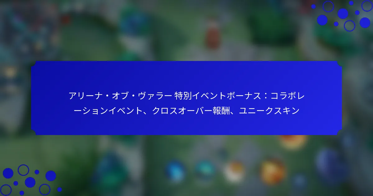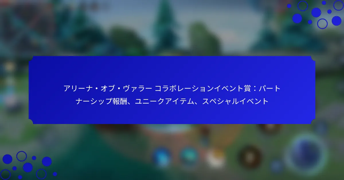 アリーナ・オブ・バラーのコラボレーションイベントでは、プレイヤーがエキサイティングなパートナーシップ報酬、ユニークなアイテム、特別なイベントに参加する機会が提供されます。参加することで、プレイヤーはスキンやゲーム内通貨などの独占的な賞品を獲得でき、ゲーム体験やキャラクターのカスタマイズを向上させることができます。楽しむためには、プレイヤーはゲームインターフェースを通じて登録し、最新のアップデートがインストールされていることを確認する必要があります。 アリーナ・オブ・バラーのコラボレーションイベントの主な特徴は何ですか? アリーナ・オブ・バラーのコラボレーションイベントでは、プレイヤーのエンゲージメントと楽しみを高めるために設計されたさまざまなパートナーシップ報酬、ユニークなアイテム、特別なイベントが用意されています。プレイヤーは、これらのコラボレーション活動に参加することで独占的なコンテンツや賞品を獲得する機会を期待できます。 コラボレーションイベントの構造の概要 コラボレーションイベントは、人気のフランチャイズとのパートナーシップを中心に構成されており、プレイヤーにテーマに沿ったコンテンツと報酬を提供します。各イベントには通常、期間限定のミッション、チャレンジ、提携ブランドを反映した特別なゲーム内アイテムが含まれています。 プレイヤーは、クエストの完了、バトルへの参加、アイテムの収集など、さまざまな活動に参加できます。これらの活動はアクセスしやすく楽しめるように設計されており、プレイヤーが新しいコンテンツを探索しながら報酬を獲得することを促します。 イベントにおけるパートナーシップの重要性 パートナーシップは、コラボレーションイベントにおいて新しいコンテンツを提供し、新しいプレイヤーを引き付ける重要な役割を果たします。著名なフランチャイズとのコラボレーションは、ゲームの魅力を高め、これらのブランドのファンに共鳴するユニークな体験を提供します。 これらのパートナーシップは、コラボレーションの外では入手できない独占的なスキン、キャラクター、ゲーム内イベントを生み出すことがよくあります。この独占性は、プレイヤーのエンゲージメントを促進し、ゲームと提携フランチャイズの両方のファンの間にコミュニティ意識を育むことができます。 過去のイベントとの比較におけるユニークな側面 このコラボレーションイベントは、過去のイベントとは異なるいくつかのユニークな側面を導入しています。たとえば、クロスフランチャイズ要素の統合により、これまでに見られなかった革新的なゲームプレイメカニクスやテーマに沿ったコンテンツが可能になります。 さらに、イベントでは、参加のインセンティブを高めるためのティア報酬など、強化された報酬システムが特徴となる場合があります。これにより、プレイヤーはコンテンツにより深く関与し、高い成果を目指すことが促されます。 イベントのタイムラインと期間 コラボレーションイベントのタイムラインは通常数週間にわたり、プレイヤーが参加して報酬を獲得するための十分な時間を提供します。具体的な日付は事前に発表され、プレイヤーはコンテンツに参加する時期を明確に理解できます。 この期間中、プレイヤーは定期的なアップデートや新しいチャレンジが提供され、体験を新鮮でエキサイティングなものに保つことが期待されます。イベントのスケジュールを監視することは、参加と報酬を最大化するために重要です。 プレイヤーのためのイベントのアクセス可能性 コラボレーションイベントは、幅広いプレイヤーが参加できるように設計されており、新規ユーザーとベテランユーザーの両方が参加できるようにしています。ほとんどの活動は、さまざまなスキルレベルに対応するように構成されており、誰でもイベントを楽しむことができます。 プレイヤーは、メインゲームインターフェースを通じてイベントコンテンツに簡単にアクセスでき、参加方法についての明確な指示が提供されます。このユーザーフレンドリーなアプローチは、包括性を促進し、より多くのプレイヤーがイベントに参加することを奨励します。 コラボレーションイベント中にプレイヤーが獲得できる賞品は何ですか? コラボレーションイベント中、プレイヤーはユニークなアイテム、スキン、ゲーム内通貨など、さまざまなエキサイティングな賞品を獲得できます。これらの報酬はゲーム体験を向上させ、プレイヤーにキャラクターやゲームプレイをカスタマイズする機会を提供します。 利用可能なパートナーシップ報酬の種類 コラボレーションイベントでは、プレイヤーが参加を通じて獲得できる複数の種類のパートナーシップ報酬が用意されています。これらの報酬には、通常、独占的なスキン、キャラクターのアンロック、イベント外では入手できないテーマに